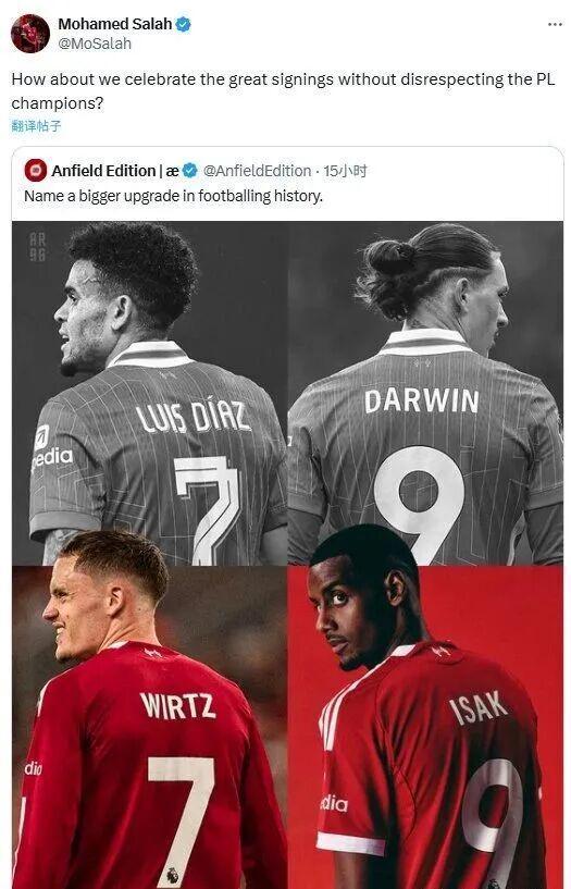 实际上,利物浦队内并非只有斯洛特一人对球队的夏窗操作感到不满。萨拉赫也曾在社交媒体上隐晦地表达过自己的不满。赛季初,利物浦球迷账号AnfieldEdition发布了一张图片,将离队的努涅斯、迪亚斯与新援维尔茨、伊萨克并列,并配文:“足坛历史上还有比这更重磅的升级吗?”